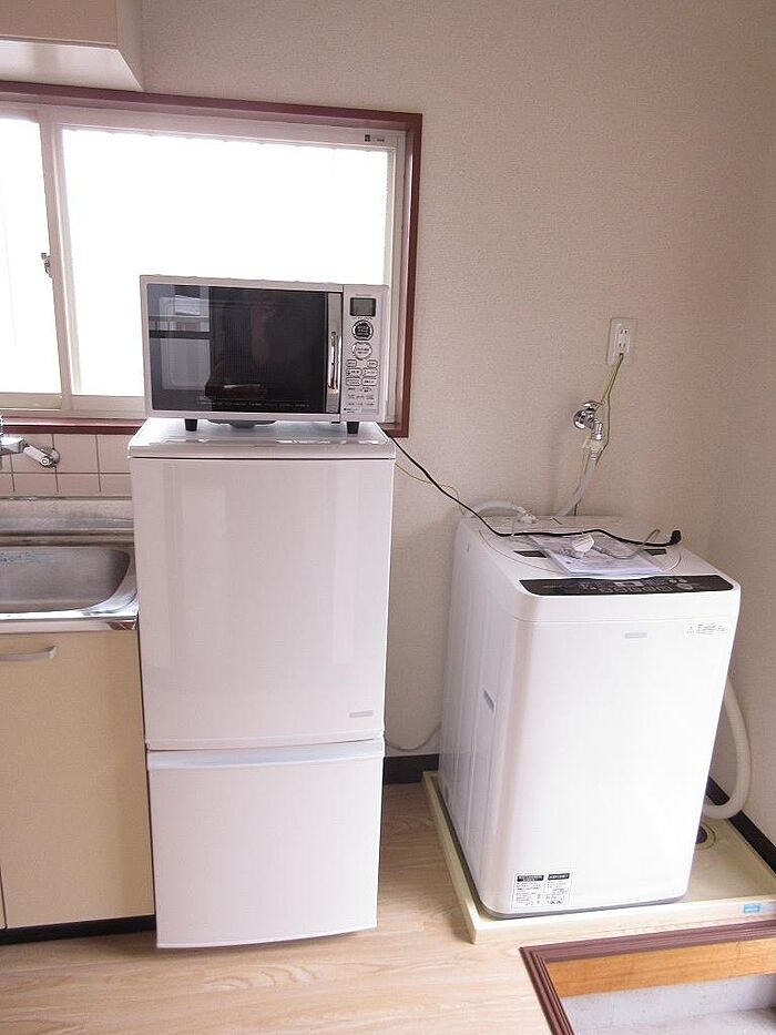 冷蔵庫・洗濯機・電子レンジ・2口ガスコンロ付き。敷金0円礼金0円仲介手数料0円、お家賃1カ月無料特典ありで契約金がお値打ちです。 2年未満で解約の場合は家賃の2カ月分の違約金が必要です。