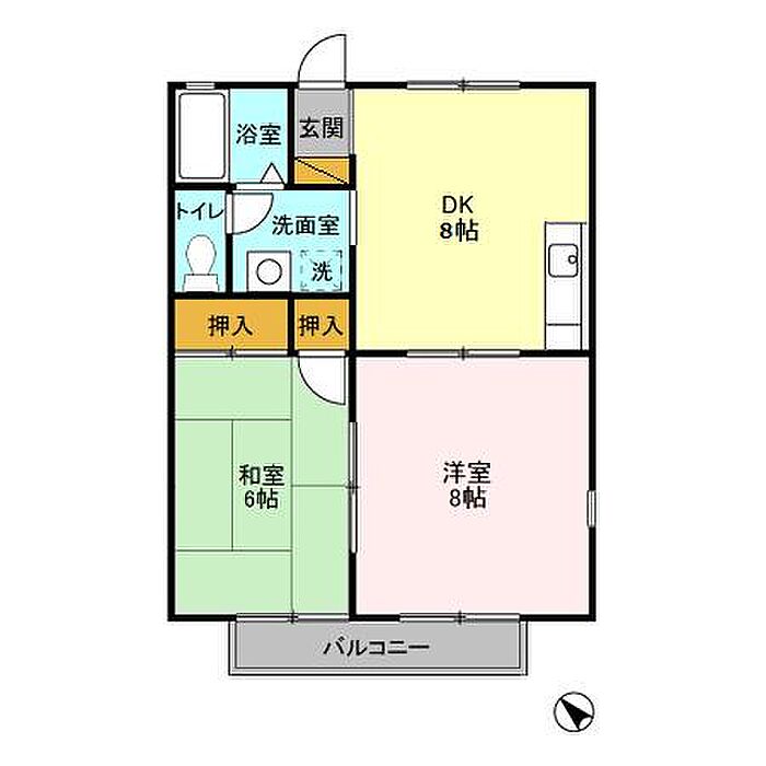 ダイニングキッチン・溶質どちらも8帖のひろびろした2DKタイプの物件です。