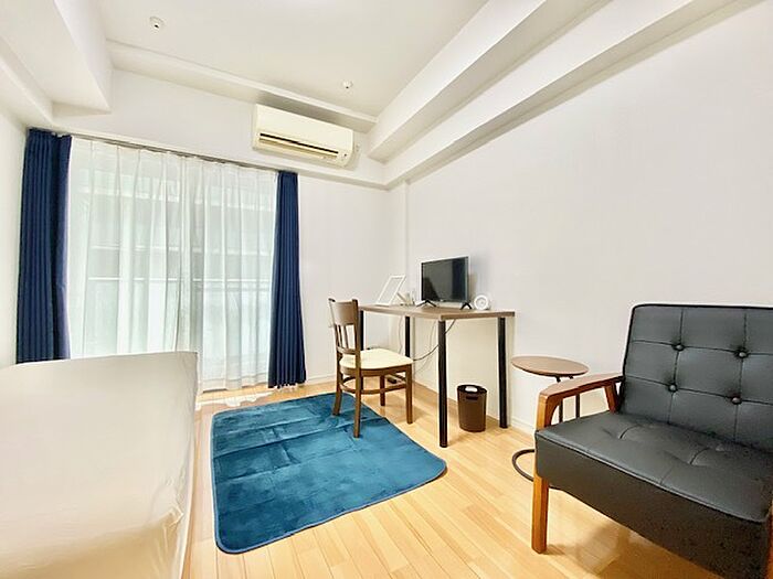 家具家電付き賃貸マンション。約60種類:テレビ・冷蔵庫・掃除機・洗濯機・電子レンジ・照明・エアコン・エアコン・ベッド・テーブル・カーテン・電気ポット、ドライヤー、目ざまし時計・キッチン、浴室用品一式等