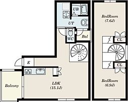 2LDKの間取りの中には、住戸内に階段を設けている2階建てタイプのメゾネット型もあります。デザイナーズマンションでよく見られる間取りですが、下の階にLDKとお風呂、トイレなどの水回りを配置し、上の階に2つの居室を配置している間取りが一般的です。