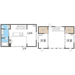 2LDKの間取りの中には、住戸内に階段を設けている2階建てタイプのメゾネット型もあります。デザイナーズマンションでよく見られる間取りですが、下の階にLDKとお風呂、トイレなどの水回りを配置し、上の階に2つの居室を配置している間取りが一般的です。