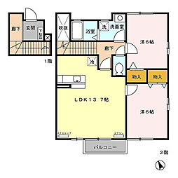 2LDKの間取りの中には、住戸内に階段を設けている2階建てタイプのメゾネット型もあります。デザイナーズマンションでよく見られる間取りですが、下の階にLDKとお風呂、トイレなどの水回りを配置し、上の階に2つの居室を配置している間取りが一般的です。
