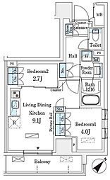 2LDKの間取りの中には、住戸内に階段を設けている2階建てタイプのメゾネット型もあります。デザイナーズマンションでよく見られる間取りですが、下の階にLDKとお風呂、トイレなどの水回りを配置し、上の階に2つの居室を配置している間取りが一般的です。