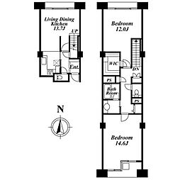 2LDKの間取りの中には、住戸内に階段を設けている2階建てタイプのメゾネット型もあります。デザイナーズマンションでよく見られる間取りですが、下の階にLDKとお風呂、トイレなどの水回りを配置し、上の階に2つの居室を配置している間取りが一般的です。