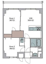 2LDKの間取りの中には、住戸内に階段を設けている2階建てタイプのメゾネット型もあります。デザイナーズマンションでよく見られる間取りですが、下の階にLDKとお風呂、トイレなどの水回りを配置し、上の階に2つの居室を配置している間取りが一般的です。