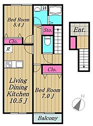 2LDKの間取りの中には、住戸内に階段を設けている2階建てタイプのメゾネット型もあります。デザイナーズマンションでよく見られる間取りですが、下の階にLDKとお風呂、トイレなどの水回りを配置し、上の階に2つの居室を配置している間取りが一般的です。