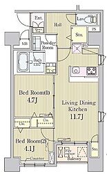 2LDKの間取りの中には、住戸内に階段を設けている2階建てタイプのメゾネット型もあります。デザイナーズマンションでよく見られる間取りですが、下の階にLDKとお風呂、トイレなどの水回りを配置し、上の階に2つの居室を配置している間取りが一般的です。