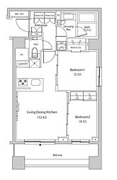 2LDKの間取りの中には、住戸内に階段を設けている2階建てタイプのメゾネット型もあります。デザイナーズマンションでよく見られる間取りですが、下の階にLDKとお風呂、トイレなどの水回りを配置し、上の階に2つの居室を配置している間取りが一般的です。