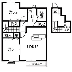 2LDKの間取りの中には、住戸内に階段を設けている2階建てタイプのメゾネット型もあります。デザイナーズマンションでよく見られる間取りですが、下の階にLDKとお風呂、トイレなどの水回りを配置し、上の階に2つの居室を配置している間取りが一般的です。