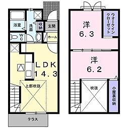 2LDKの間取りの中には、住戸内に階段を設けている2階建てタイプのメゾネット型もあります。デザイナーズマンションでよく見られる間取りですが、下の階にLDKとお風呂、トイレなどの水回りを配置し、上の階に2つの居室を配置している間取りが一般的です。
