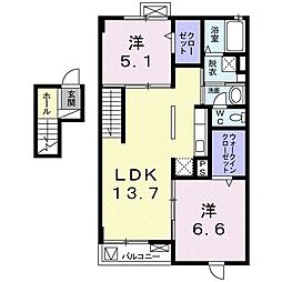 2LDKの間取りの中には、住戸内に階段を設けている2階建てタイプのメゾネット型もあります。デザイナーズマンションでよく見られる間取りですが、下の階にLDKとお風呂、トイレなどの水回りを配置し、上の階に2つの居室を配置している間取りが一般的です。