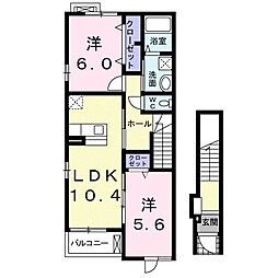 2LDKの間取りの中には、住戸内に階段を設けている2階建てタイプのメゾネット型もあります。デザイナーズマンションでよく見られる間取りですが、下の階にLDKとお風呂、トイレなどの水回りを配置し、上の階に2つの居室を配置している間取りが一般的です。