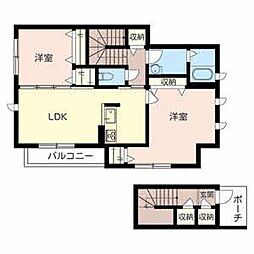 2LDKの間取りの中には、住戸内に階段を設けている2階建てタイプのメゾネット型もあります。デザイナーズマンションでよく見られる間取りですが、下の階にLDKとお風呂、トイレなどの水回りを配置し、上の階に2つの居室を配置している間取りが一般的です。