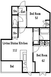 2LDKの間取りの中には、住戸内に階段を設けている2階建てタイプのメゾネット型もあります。デザイナーズマンションでよく見られる間取りですが、下の階にLDKとお風呂、トイレなどの水回りを配置し、上の階に2つの居室を配置している間取りが一般的です。