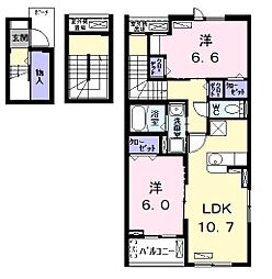 2LDKの間取りの中には、住戸内に階段を設けている2階建てタイプのメゾネット型もあります。デザイナーズマンションでよく見られる間取りですが、下の階にLDKとお風呂、トイレなどの水回りを配置し、上の階に2つの居室を配置している間取りが一般的です。