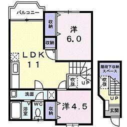 2LDKの間取りの中には、住戸内に階段を設けている2階建てタイプのメゾネット型もあります。デザイナーズマンションでよく見られる間取りですが、下の階にLDKとお風呂、トイレなどの水回りを配置し、上の階に2つの居室を配置している間取りが一般的です。