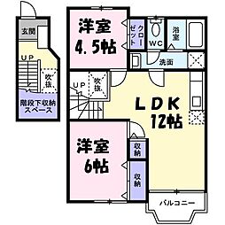 2LDKの間取りの中には、住戸内に階段を設けている2階建てタイプのメゾネット型もあります。デザイナーズマンションでよく見られる間取りですが、下の階にLDKとお風呂、トイレなどの水回りを配置し、上の階に2つの居室を配置している間取りが一般的です。