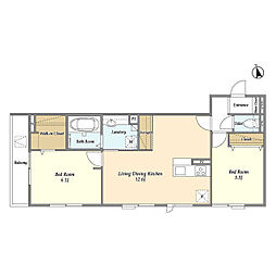 2LDKの間取りの中には、住戸内に階段を設けている2階建てタイプのメゾネット型もあります。デザイナーズマンションでよく見られる間取りですが、下の階にLDKとお風呂、トイレなどの水回りを配置し、上の階に2つの居室を配置している間取りが一般的です。