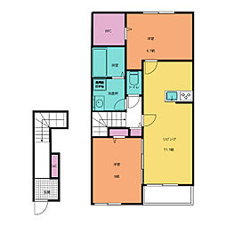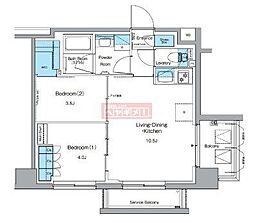 2LDKの間取りの中には、住戸内に階段を設けている2階建てタイプのメゾネット型もあります。デザイナーズマンションでよく見られる間取りですが、下の階にLDKとお風呂、トイレなどの水回りを配置し、上の階に2つの居室を配置している間取りが一般的です。
