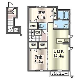 2LDKの間取りの中には、住戸内に階段を設けている2階建てタイプのメゾネット型もあります。デザイナーズマンションでよく見られる間取りですが、下の階にLDKとお風呂、トイレなどの水回りを配置し、上の階に2つの居室を配置している間取りが一般的です。