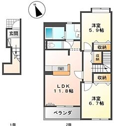 2LDKの間取りの中には、住戸内に階段を設けている2階建てタイプのメゾネット型もあります。デザイナーズマンションでよく見られる間取りですが、下の階にLDKとお風呂、トイレなどの水回りを配置し、上の階に2つの居室を配置している間取りが一般的です。