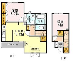 2LDKの間取りの中には、住戸内に階段を設けている2階建てタイプのメゾネット型もあります。デザイナーズマンションでよく見られる間取りですが、下の階にLDKとお風呂、トイレなどの水回りを配置し、上の階に2つの居室を配置している間取りが一般的です。